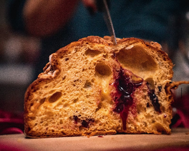 farina di GRANO tenero tipo 0, crema alla visciola 25% (bevanda alcolica a base di mosto d’uva fermentato e visciole, succo fermentato di visciola (succo di visciola, zucchero), zucchero, addensante: pectina), BURRO, succo fermentato di visciola (succo di visciola, zucchero), zucchero, tuorlo d’UOVO, LATTE (reidratato), fruttosio, lievito madre naturale (GRANO), emulsionante: E471, sale, aromi, lievito; Glassa: zucchero, albume d’UOVO, granella di zucchero, MANDORLE, farina di riso, amido, grasso vegetale (palma), aromi. CONTIENE SOLFITI